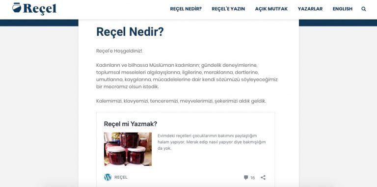 A screenshot of the Reçel (jam) website, which  Çamdereli launched with friends in September 2014. This website is aimed at empowering observant Turkish Muslim women, and provides a platform where they can discuss the challenges and discrimination they face.