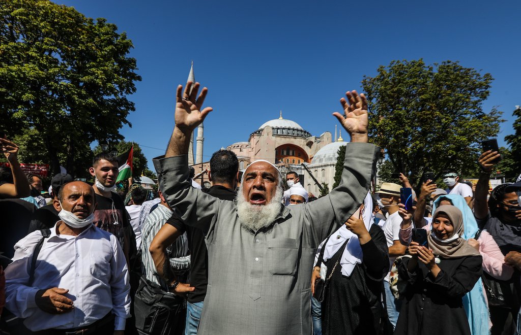 From July 10, when the government opened discussions to cancel the 1934 decree that turned the Hagia Sophia into a museum, small groups of Muslim worshippers began gathering in the building’s courtyard after Friday prayers, along with some radical Islamist groups. One such group, calling itself Anatolian Raiders, gathered under a banner that declared “the future belongs to Islam” and shouted the slogan, “Chains are broken, Hagia Sophia is opened.”