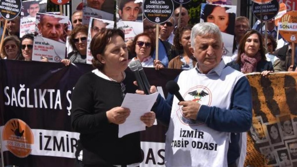 Board member of the Turkish Medical Association in the Aegean city of İzmir, Mübeccel İlhan, reads the press release during a protest about the violence against health workers. (Caption: Taylan Yıldız)