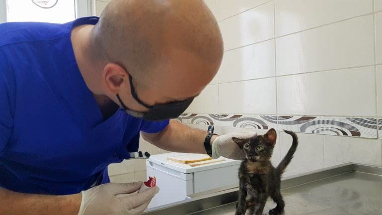 A kitten receives medical care in an animal rehabilitation center in the Sisli district. Sick or injured stray animals are treated and then released again.