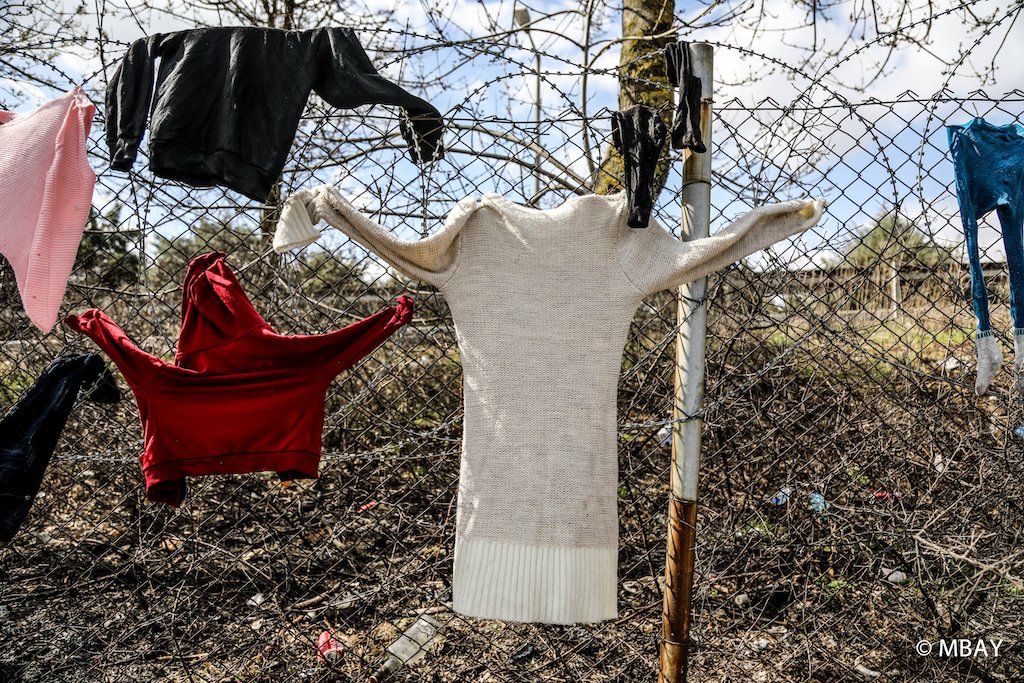 Refugees who have been waiting outside for days, hang their clothes on the wire fences in order to dry them after the rain, 7 March, 2020 (Credit: Murat Bay)