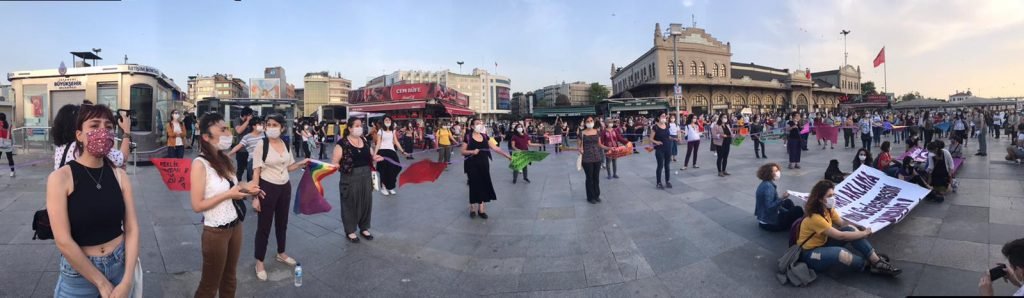 Public protest in Turkey, already diminished after the crackdown following the 2013 Gezi Park demonstrations, has become almost impossible since the attempted coup of 2016. However, feminist activists still regularly found ways to take to the streets, spurred by the slogan, “we won’t abandon the night, the streets, or the squares.” This slogan refers to the women’s demand to be able to go out at night and to protest, without being afraid for their safety.
