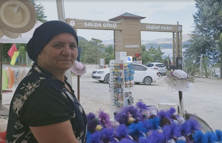 A lifelong resident of Yeşilova district where Salda is located, Emine Kıyak has been tending to a booth at the park’s entrance for two years, selling lavender products alongside beach gear. She told Inside Turkey that visitor numbers had fallen since construction work changed the colour of the water and the sand.